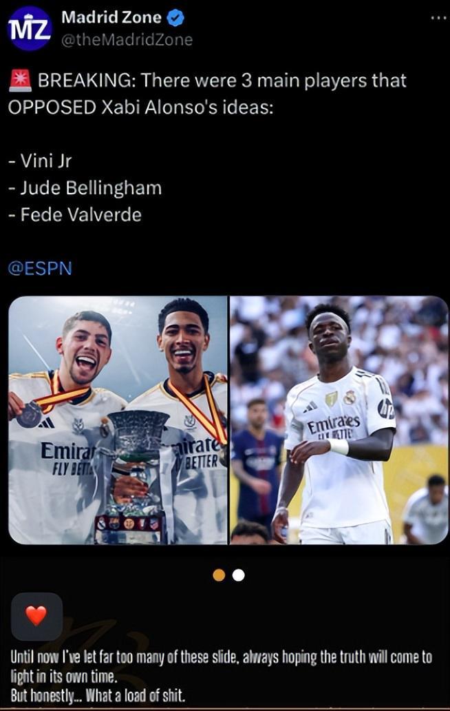 阿隆索的身边人士点出了三位球员的名字,分别是维尼修斯,还有贝林厄姆和巴尔韦德。维尼修斯和阿隆索的矛盾早已公开化,该人士表示,贝林厄姆和维尼修斯不同,两人的分歧并没有公开化。